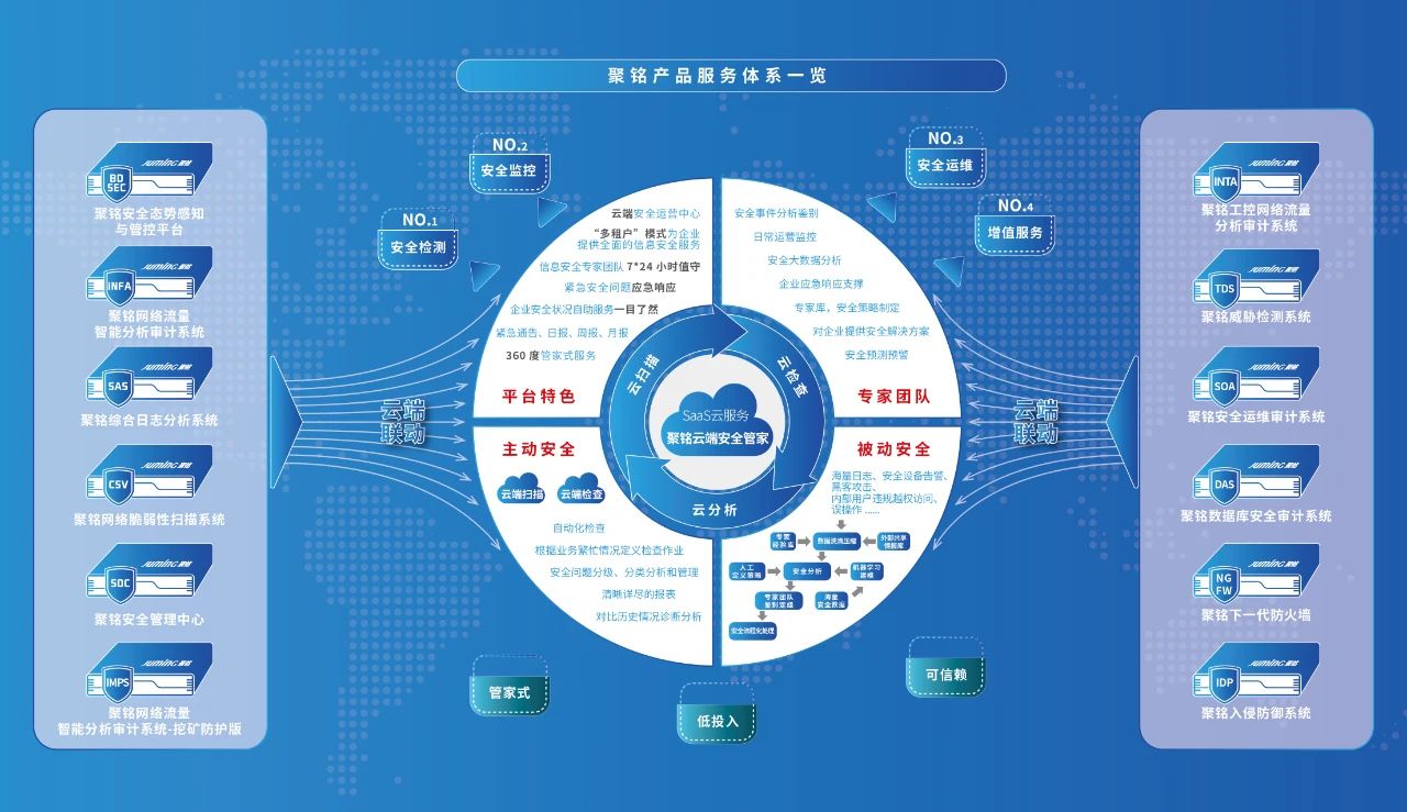 聚铭网络成立于2016年,是由腾讯、国家中小企业发展子基金、江苏高投毅达宁海创业投资基金等投资的国内领先的安全运营商。公司专注于网络安全智能分析和检测,提供全面的信息安全防护,致力于让安全更简单。聚铭网络规划的“云+端”产品服务一体化解决方案,涵盖安全检测、安全管理、安全审计、数据安全、工控安全和信创安全等多个细分领域。目前,公司拥有已授权发明专利及软件著作权共计60余件,涉及数据防泄露、恶意网页检查、网络流量识别规则等机器学习和大数据处理技术。已为教育、医疗、政府、电信、能源、金融等行业的10000多家政企客户提供了安全服务,云端托管客户超过6500家。