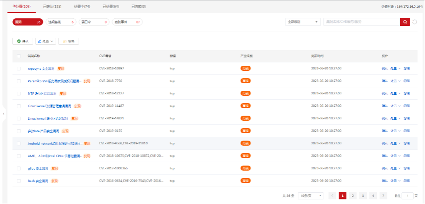 针对每个设备,资产风险生命周期管理功能可以利用风险数据从多个维度分析内网信息系统存在的隐患,并第一时间下钻到处置页面进行处置。