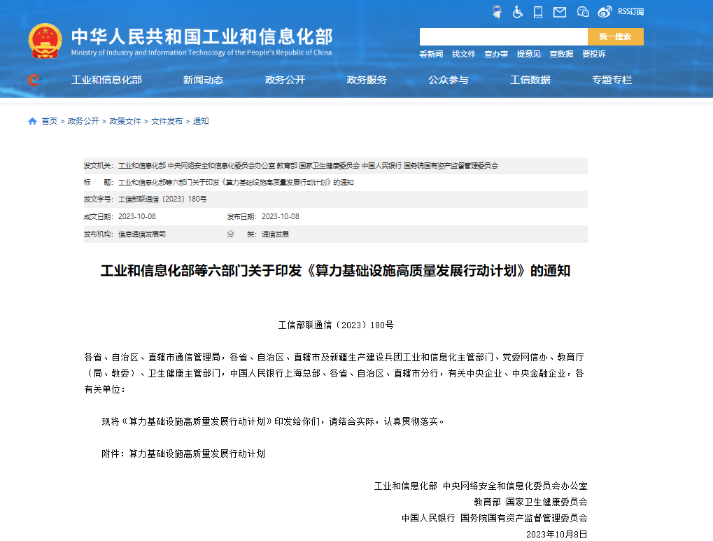 1、工业和信息化部等六部门印发《算力基础设施高质量发展行动计划》
