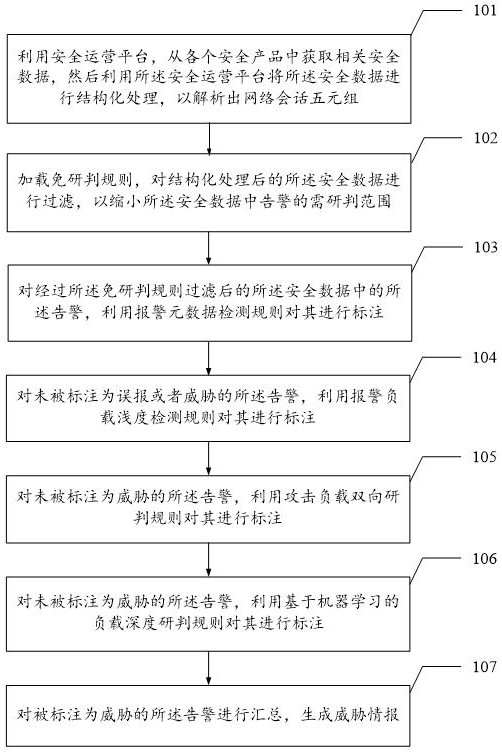 通过上述方法,在网络边界部署网络全流量(也可以在内部网络边界和内部互联部分)记录装置,以抓取所有完整网络流量,利用内部通信信道向安全运营平台提供原始攻击数据,以便于安全运维人员针对具体攻击流量进行研判。并通过多层次的规则配置方式,在报警元数据(Metadata)、报警部分负载以及攻击负载规则层面提供筛选能力,对后续可能产生的类似报警进行处理,极大地缩减了用户需要处理的安全告警数量。