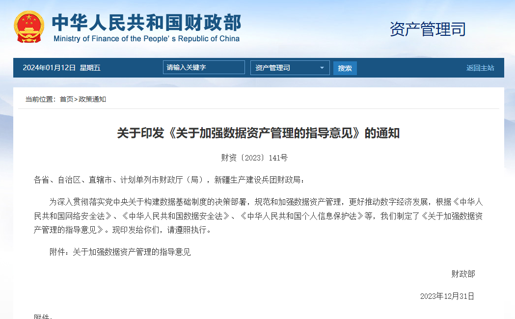 2024年1月11日,财政部发布了《关于加强数据资产管理的指导意见》。