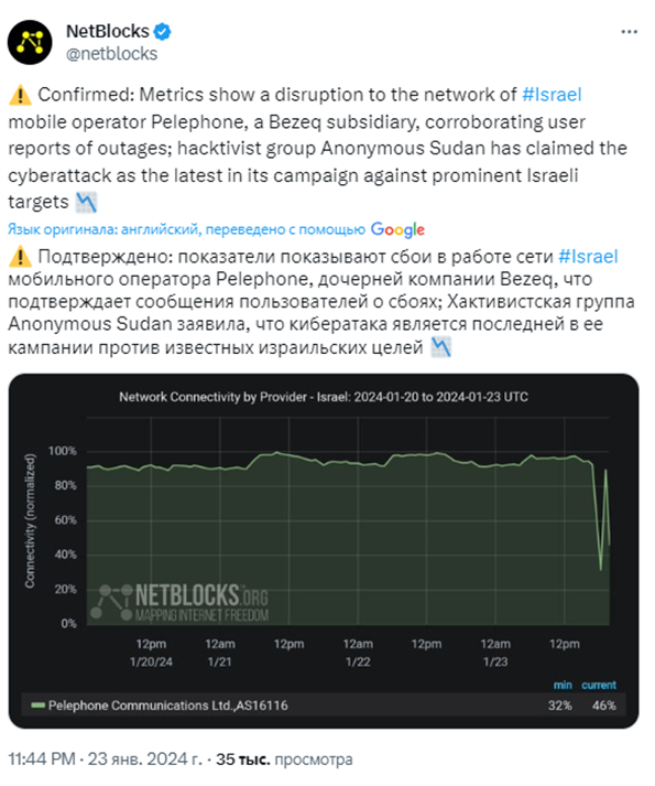 图:NetBlocks 发布有关 Pelephone 网络关闭的帖子 匿名苏丹组织声称对以色列最大的移动运营商和电信公司之一的基础设施造成了“毁灭性打击”。