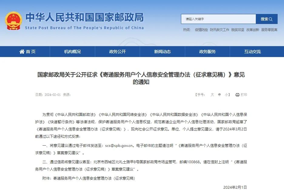 《寄递服务用户个人信息安全管理办法(征求意见稿)》公开征求意见 为贯彻《中华人民共和国邮政法》《中华人民共和国网络安全法》《中华人民共和国数据安全法》《中华人民共和国个人信息保护法》《快递暂行条例》等法律法规,保护寄递服务用户个人信息权益,规范寄递企业用户个人信息处理活动,国家邮政局日前起草了《寄递服务用户个人信息安全管理办法(征求意见稿)》(以下简称“管理办法”),现向社会公开征求意见。 现将该管理办法征求意见稿面向社会公开征求意见,如有意见或建议请于2024年3月2日前反馈。