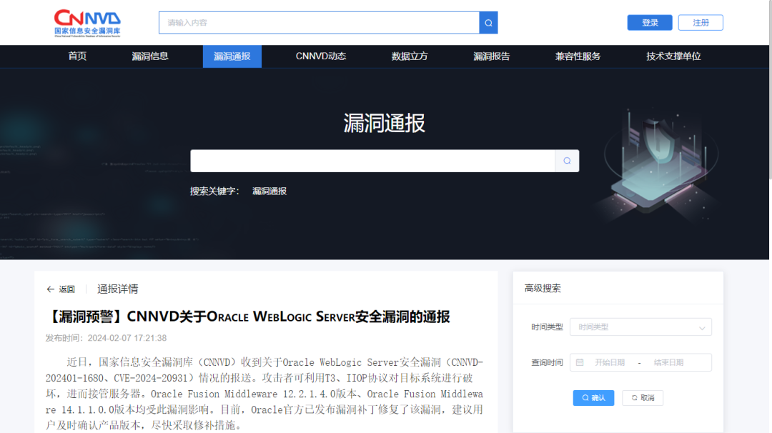 业内新闻速览 CNNVD关于Oracle WebLogic Server安全漏洞的通报 近日,国家信息安全漏洞库(CNNVD)收到关于Oracle WebLogic Server安全漏洞(CNNVD-202401-1680、CVE-2024-20931)情况的报送。攻击者可利用T3、IIOP协议对目标系统进行破坏,进而接管服务器。Oracle Fusion Middleware 12.2.1.4.0版本、Oracle Fusion Middleware 14.1.1.0.0版本均受此漏洞影响。目前,Oracle官方已发布漏洞补丁修复了该漏洞,建议用户及时确认产品版本,尽快采取修补措施。 一、漏洞介绍 Oracle WebLogic Server是美国甲骨文(Oracle)公司开发的一款适用于云环境和传统环境的应用服务中间件,它提供了一个现代轻型开发平台,支持应用从开发到生产的整个生命周期管理,并简化了应用的部署和管理。 Oracle WebLogic Server存在安全漏洞。攻击者可利用T3、IIOP协议对目标系统进行破坏,进而接管服务器。 二、危害影响 Oracle Fusion Middleware 12.2.1.4.0版本、Oracle Fusion Middleware 14.1.1.0.0版本均受此漏洞影响。 三、修复建议 目前,Oracle官方已发布漏洞补丁修复了该漏洞,建议用户及时确认产品版本,尽快采取修补措施。 官方参考链接:https://www.oracle.com/security-alerts/cpuapr2023.html。