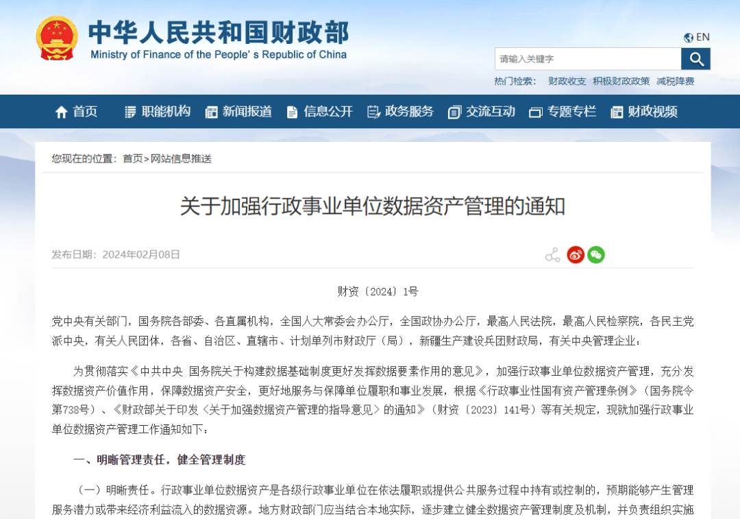 财政部印发《关于加强行政事业单位数据资产管理的通知》 财政部日前印发通知,加强行政事业单位数据资产管理,充分发挥数据资产价值作用。 按照通知,行政事业单位数据资产是指各级行政事业单位在依法履职或提供公共服务过程中持有或控制的,预期能够产生管理服务潜力或带来经济利益流入的数据资源。 通知明确,行政事业单位主要通过自主采集、生产加工、购置等方式配置数据资产。加强数据资产源头管理,在依法履职或提供公共服务过程中,应当按照规定的范围、方法、技术标准等进行自主采集、生产加工数据形成资产。通过购置方式配置数据资产的,应当根据依法履职和事业发展需要,落实过紧日子要求,按照预算管理规定科学配置,涉及政府采购的应当执行政府采购有关规定。 在开放共享方面,通知提出,在确保公共安全和保护个人隐私的前提下,加强数据资产汇聚共享和开发开放,促进数据资产使用价值充分利用。加大数据资产供给使用,推动用于公共治理、公益事业的数据资产有条件无偿使用,探索用于产业发展、行业发展的数据资产有条件有偿使用。依法依规予以保密的数据资产不予开放,开放共享进入市场的数据资产应当明确授权使用范围,并严格授权使用。 通知强调,要建立合理的数据资产收益分配机制,依法依规维护数据资产权益。行政单位数据资产使用形成的收入,按照政府非税收入和国库集中收缴制度的有关规定管理。事业单位数据资产使用形成的收入,由本级财政部门规定具体管理办法。除国家另有规定外,行政事业单位数据资产的处置收入按照政府非税收入和国库集中收缴制度的有关规定管理。任何行政事业单位及个人不得违反国家规定,多收、少收、不收、少缴、不缴、侵占、私分、截留、占用、挪用、隐匿、坐支数据资产相关收入。 此外,通知还指出,要严格防控风险,确保数据安全。建立数据资产安全管理制度和监测预警、应急处置机制,推进数据资产分类分级管理,把安全贯穿数据资产全生命周期管理,有效防范和化解各类数据资产安全风险,切实筑牢数据资产安全保障防线。