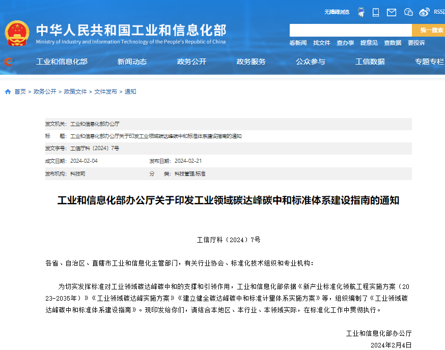 工信部印发《工业领域碳达峰碳中和标准体系建设指南》 2月21日,工业和信息化部办公厅发布关于印发工业领域碳达峰碳中和标准体系建设指南的通知(以下简称《建设指南》),旨在切实发挥标准对工业领域碳达峰碳中和的支撑和引领作用。 其中提到,到2025年,初步建立工业领域碳达峰碳中和标准体系,制定200项以上碳达峰急需标准,重点制定基础通用、温室 气体核算、低碳技术与装备等领域标准,为工业领域开展碳评估、降低碳排放等提供技术支撑。到2030年,形成较为完善的工业领域碳达峰碳中和标准体系,加快制定协同降碳、碳排放管理、低碳评价类标准,实现重点行业重点领域标准全覆盖,支撑工业领域碳排放全面达峰,标准化工作重点逐步向碳中和目标转变。此外,《建设指南》中还提出了工业领域碳达峰碳中和标准体系框架,包括基础通用、核算与核查、技术与装备、监测、管理与评价等五大类标准。规划了重点标准的研制方向,注重与现有工业节能与综合利用标准体系、绿色制造标准体系的有效衔接。希望通过加快标准制定,持续完善标准体系,推进工业领域向低碳、零碳发展模式转变。