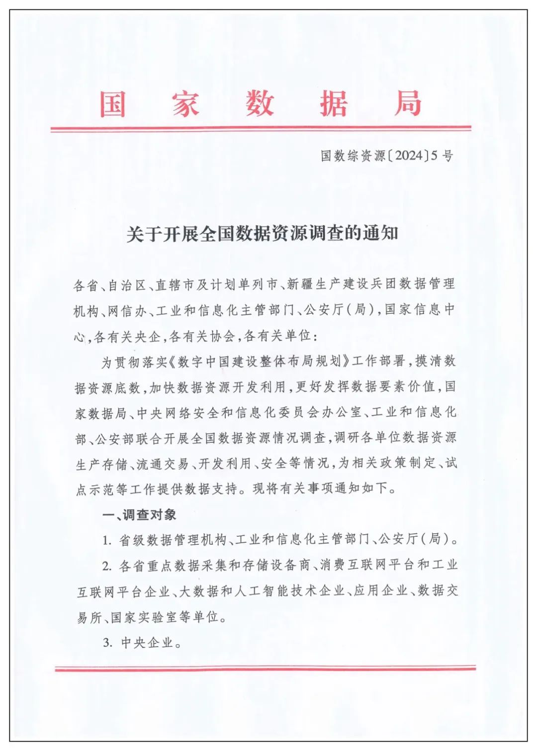 国家数据局等四部门联合开展全国数据资源情况调查 近日,国家数据局综合司、中央网信办秘书局、工业和信息化部办公厅、公安部办公厅等四部门近日联合发布了关于开展全国数据资源调查的通知。 通知称,为贯彻落实《数字中国建设整体布局规划》工作部署,摸清数据资源底数,加快数据资源开发利用,更好发挥数据要素价值,国家数据局、中央网络安全和信息化委员会办公室、工业和信息化部、公安部联合开展全国数据资源情况调查,调研各单位数据资源生产存储、流通交易、开发利用、安全等情况,为相关政策制定、试点示范等工作提供数据支持。 调查对象包括:1.省级数据管理机构、工业和信息化主管部门、公安厅(局);2.各省重点数据采集和存储设备商、消费互联网平台和工业互联网平台企业、大数据和人工智能技术企业、应用企业、数据交易所、国家实验室等单位;3.中央企业;4.行业协会商会;5.国家信息中心。 此次全国数据资源调查工作开展时间为2024年2月18日00:00至3月5日24:00。请相关单位在规定时间内登录全国数据资源调查管理平台(https://wenjuan.data-smp.cn)填报调查表。