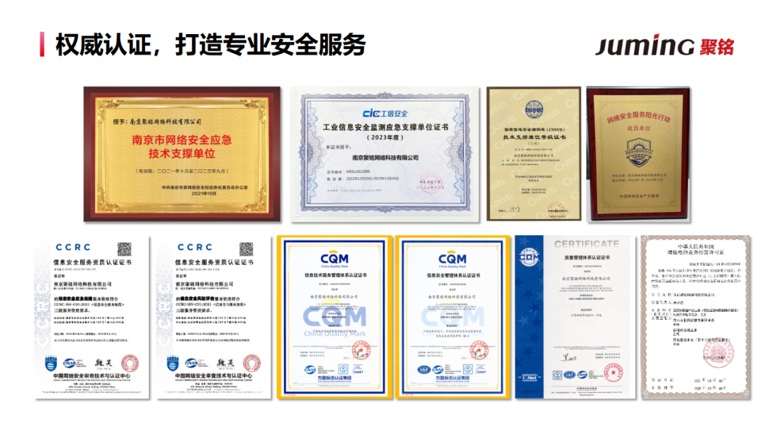 作为国内领先的安全运营商,聚铭网络始终致力于为客户提供全方位、高效的网络安全解决方案。凭借技术精湛、经验丰富的团队,公司通过了CCRC信息安全风险评估服务、CCRC信息安全应急处理服务等多项资质认证,并成功入选国家信息安全漏洞库(CNNVD)、国家工业信息安全监测应急等多项技术支撑单位,充分展示了其在网络安全领域的强大实力。