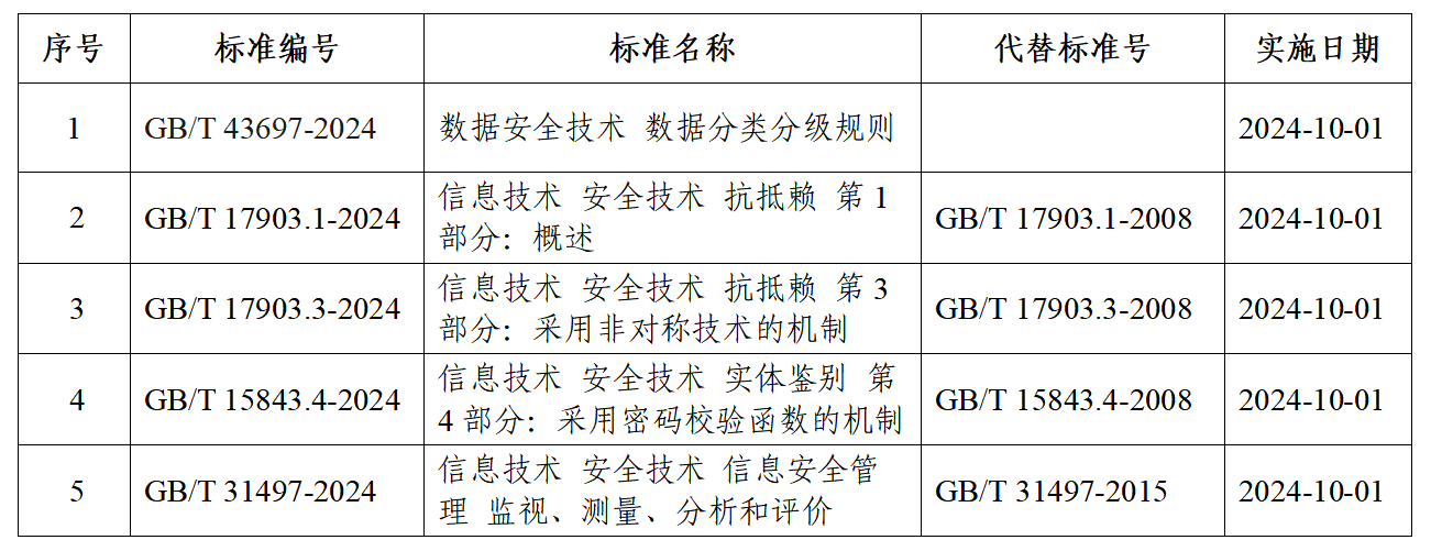 根据2024年3月15日国家市场监督管理总局、国家标准化管理委员会发布的中华人民共和国国家标准公告(2024年第1号),全国网络安全标准化技术委员会归口的5项国家标准正式发布。