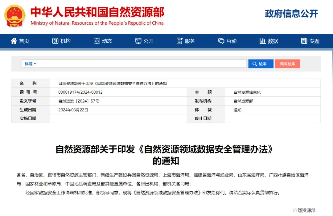 1、自然资源部发布《自然资源领域数据安全管理办法》