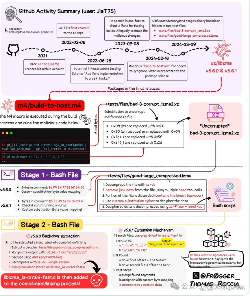微软高级威胁研究员Thomas Roccia也表示XZ攻击的复杂程度令人震惊,他绘制了一个初步的攻击流程图如下: