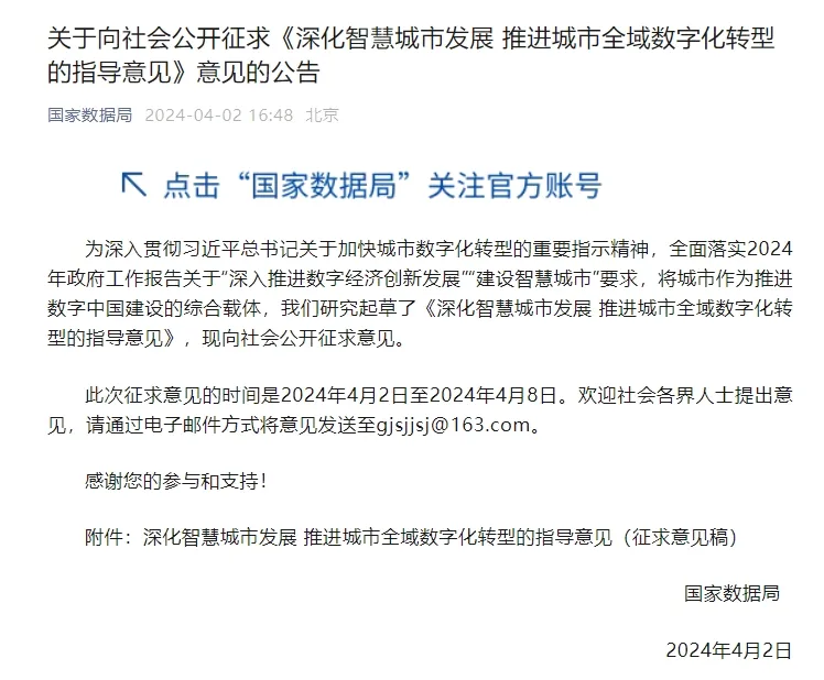 4月2日,国家数据局发布《深化智慧城市发展推进城市全域数字化转型的指导意见(征求意见稿)》(下称《指导意见》),向社会公开征求意见。此次征求意见的时间是2024年4月2日至2024年4月8日,可通过电子邮件方式将意见发送至gjsjjsj@163.com。