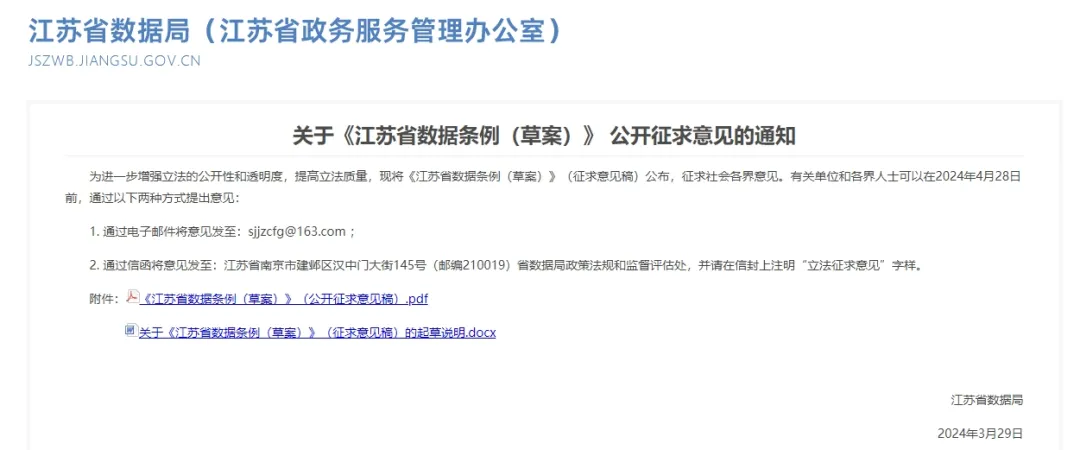 2、江苏省数据局发布《江苏省数据条例(草案)》 (征求意见稿)
