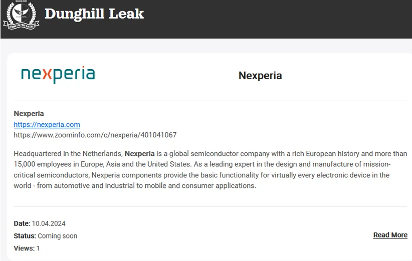 4 月 10 日,勒索网站“Dunghill Leak”宣布成功入侵了 Nexperia,声称窃取了 1 TB 的机密数据,并泄露了据称被盗文件的样本,为了证明说法的真实性,威胁攻击者公布了盗取的电子元件显微镜扫描图像、员工护照、保密协议和其他各种样本(这些样本的真实性尚未得到芯片制造商 Nexperia 的证实)。