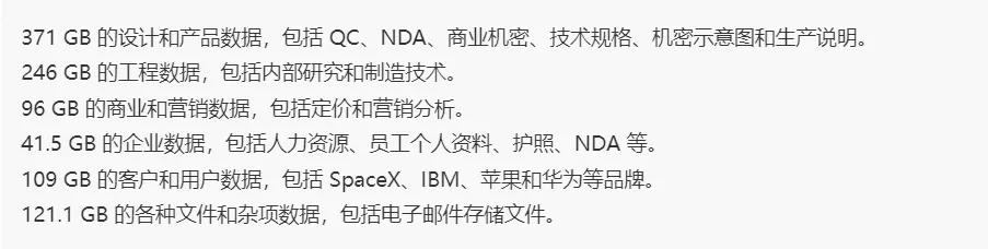 Dunghill Leak 嚣张的表示,如果 Nexperia 公司拒不支付赎金,他们计划泄露以下数据: