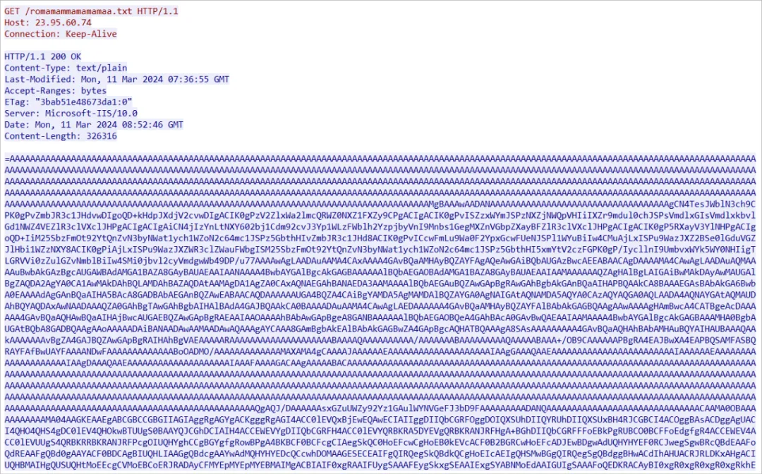 如果安装了旧版本的 Microsoft Office,漏洞利用者就会从合法的 "打开文件时粘贴.ee "服务中下载一个 Visual Basic 脚本 (VBS)。然后执行该脚本,获取包含基于 64 编码有效载荷的图像文件 (JPG)。