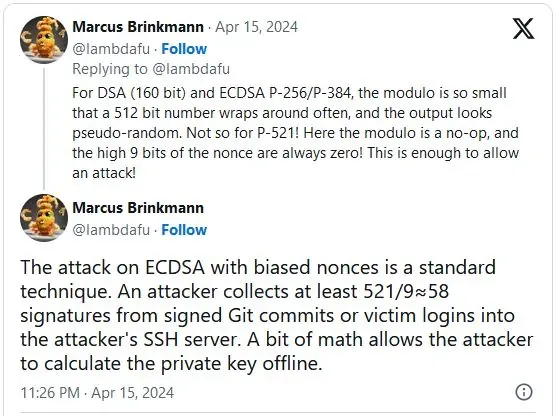 攻击者只需要访问几十条已签名消息和公钥,就能从中恢复私钥,后续就可以伪造签名,并在未经授权的情况下访问服务器。