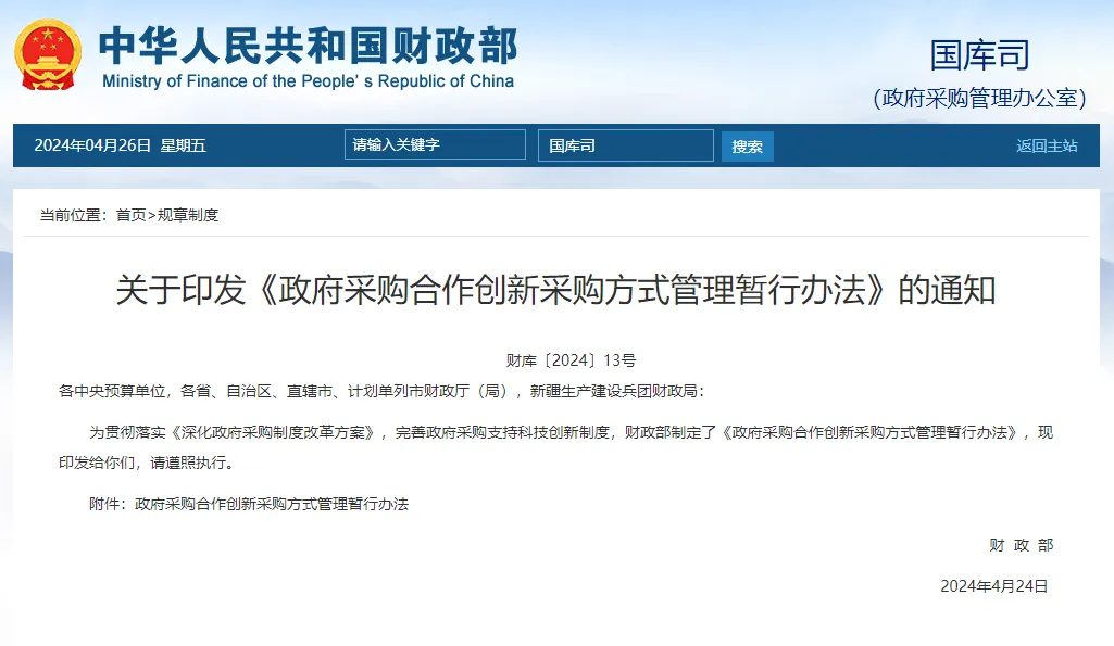为贯彻落实《深化政府采购制度改革方案》,完善政府采购支持科技创新制度,财政部于近日发布了《政府采购合作创新采购方式管理暂行办法》(以下简称《办法》),本办法将于2024年6月1日起正式施行。
