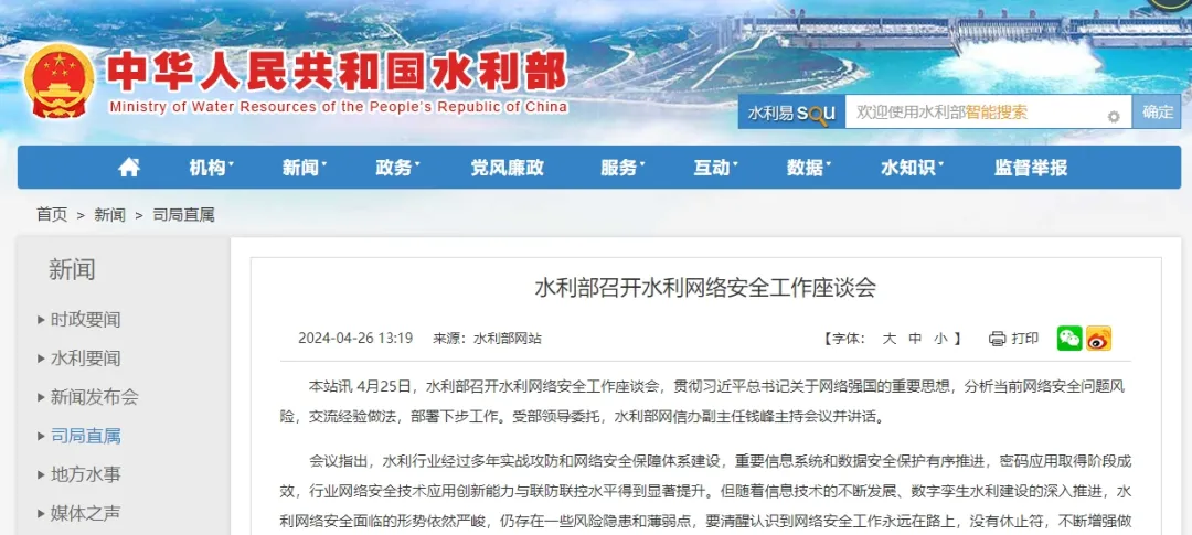 近日,水利部召开水利网络安全工作座谈会。会议指出数字孪生水利建设背景下,网络安全形势严峻,需持续增强责任感。会议强调要提升防范化解重大网络安全风险能力。