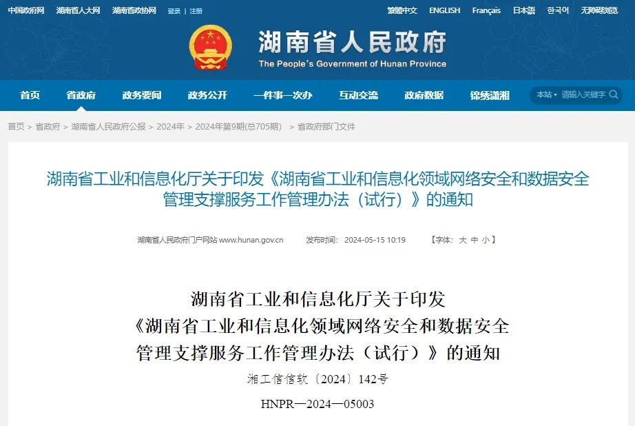 2、《湖南省工业和信息化领域网络安全和数据安全管理支撑服务工作管理办法》发布