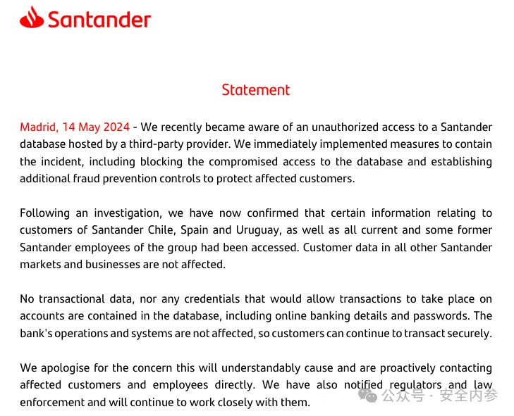安全内参5月16日消息,全球领先的金融机构桑坦德银行(Banco Santander SA)发布公告,确认发生了一起数据泄露事件,部分客户受到影响。据悉,此次事件源于一名未授权人员非法访问了由第三方服务提供商托管的银行数据库。