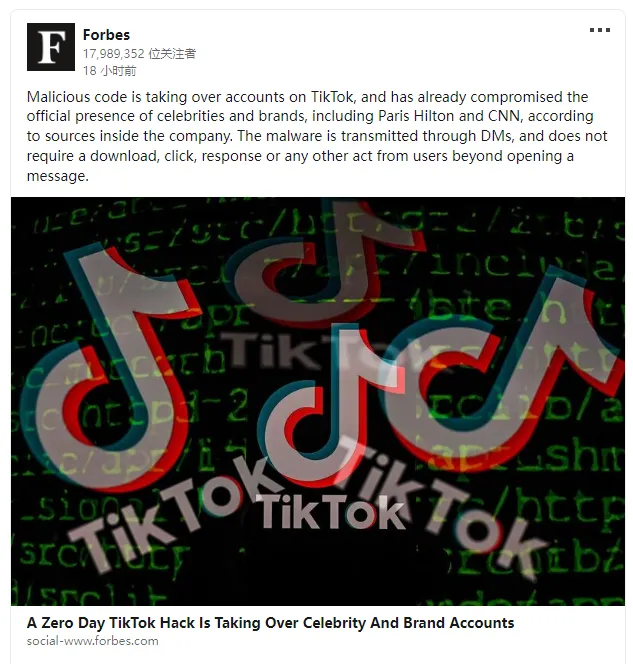 近日,攻击者利用社交媒体直接消息功能中的零日漏洞,劫持了多家知名公司和人物的TikTok 账户。