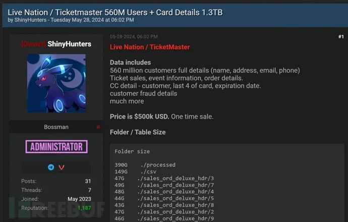 近日,黑客组织ShinyHunters在暗网数据泄露站点BreachForums上出售超过5亿Ticketmaster客户数据。