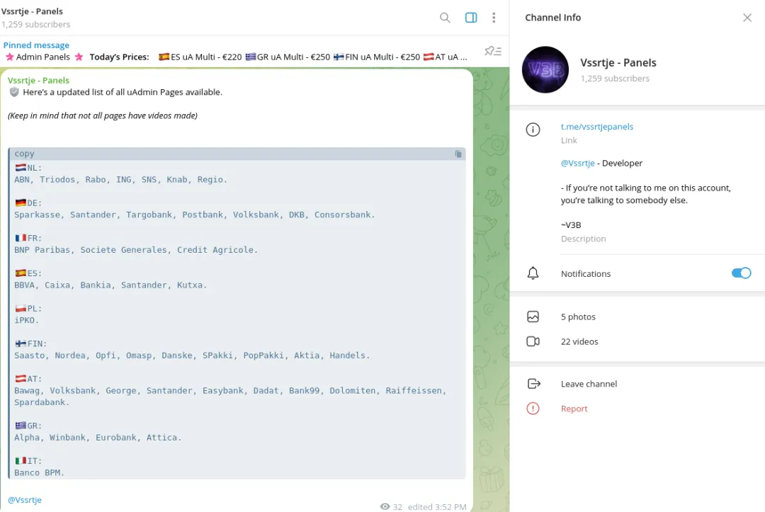 近日,有网络犯罪分子开始在 Telegram 上推广一种名为 “V3B ”的新型网络钓鱼工具包,该工具包针对爱尔兰、荷兰、芬兰、奥地利、德国、法国、比利时、希腊、卢森堡和意大利 54 家主要金融机构的客户。