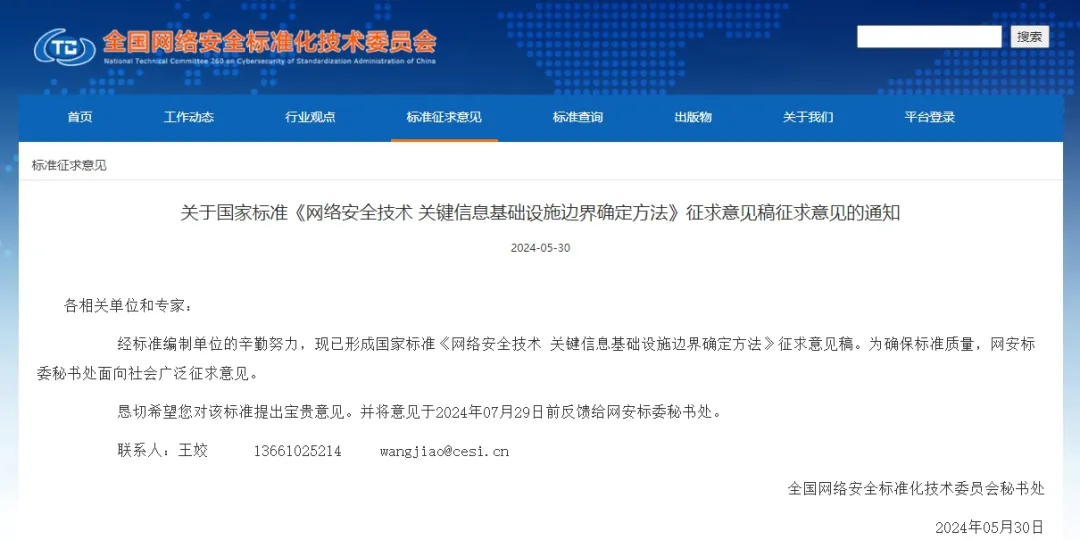 1、国家标准《网络安全技术 关键信息基础设施边界确定方法》征求意见稿发布