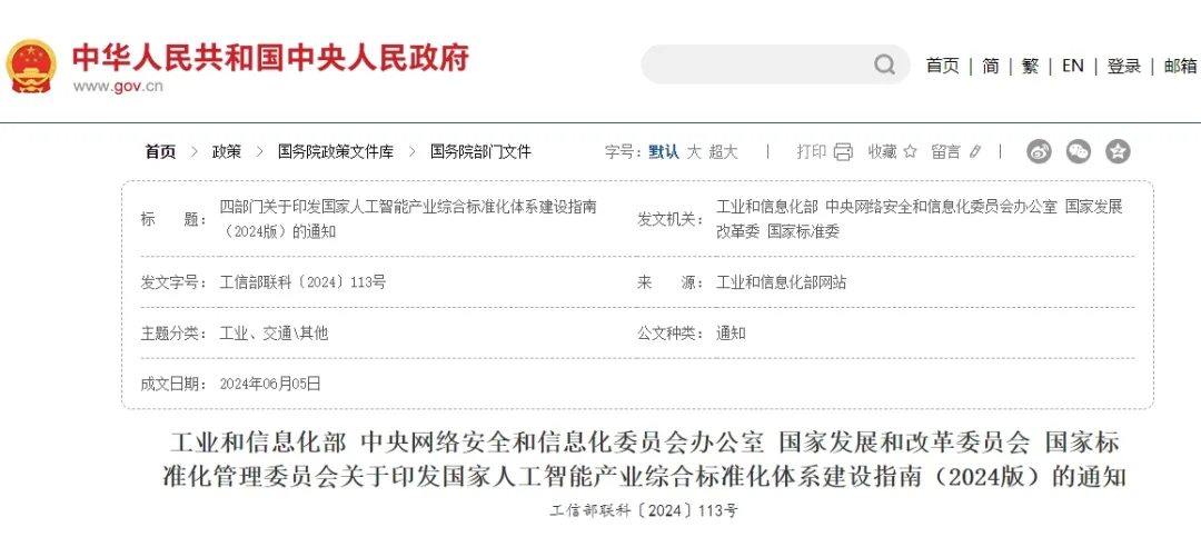 四部门联合印发《国家人工智能产业综合标准化体系建设指南 (2024版)》