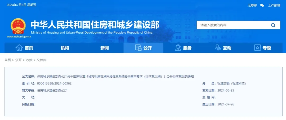 国家标准《城市轨道交通网络信息系统安全基本要求》公开征求意见
