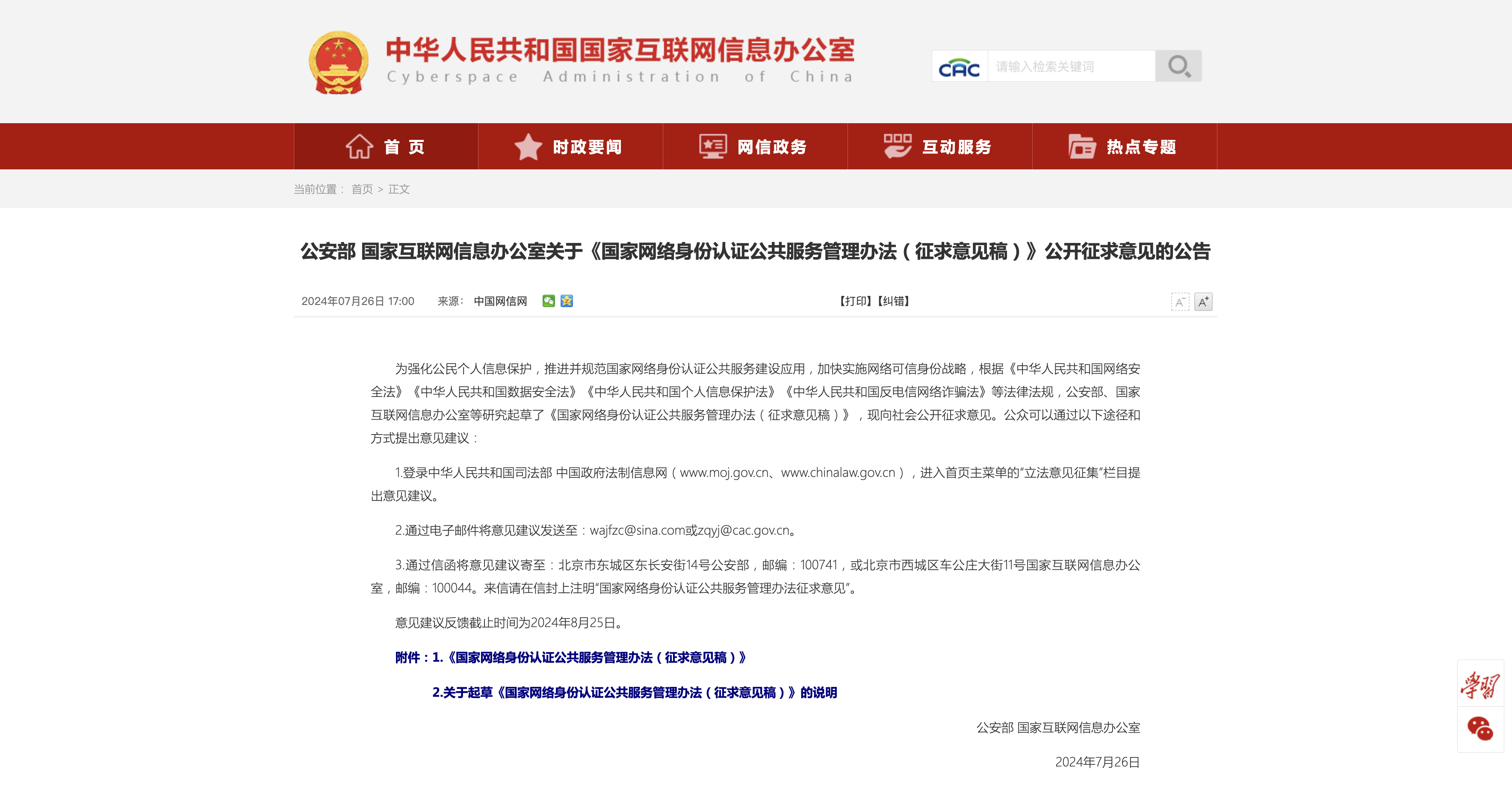 公安部 国家互联网信息办公室关于《国家网络身份认证公共服务管理办法(征求意见稿)》公开征求意见的公告 |