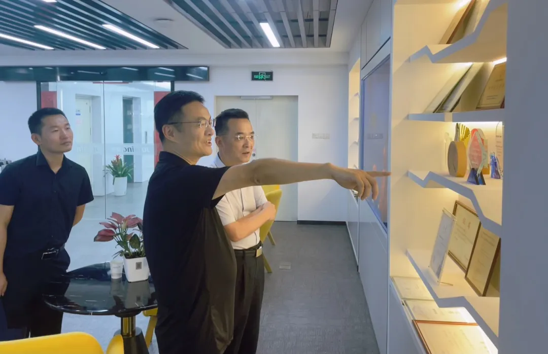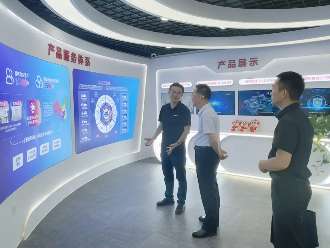 在唐开达总经理的悉心陪同下,王书记一行深入聚铭网络展厅,观摩了公司的发展历程、企业文化、愿景使命,以及一系列核心安全产品和技术应用的精彩案例。唐总介绍到聚铭网络目前已在教育、医疗、政府、电信、能源、金融等多个领域深耕细作,累计服务超过10000家政企客户,云端托管服务更是惠及超过6500家企业。