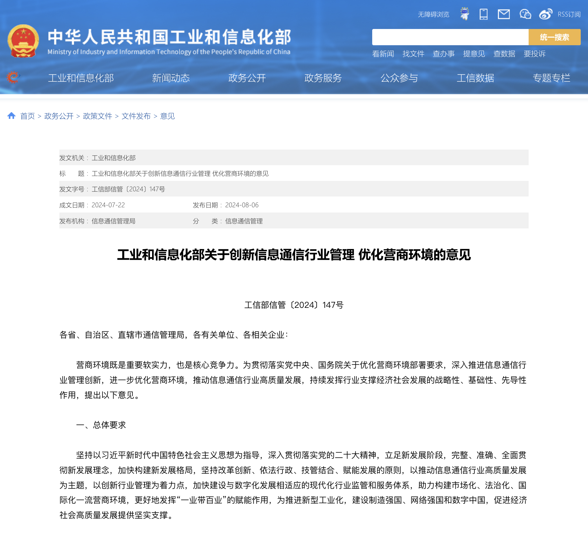 营商环境既是重要软实力,也是核心竞争力。为贯彻落实党中央、国务院关于优化营商环境部署要求,深入推进信息通信行业管理创新,进一步优化营商环境,推动信息通信行业高质量发展,持续发挥行业支撑经济社会发展的战略性、基础性、先导性作用,提出以下意见。