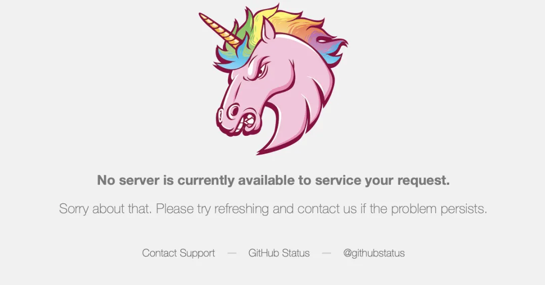 在宕机期间,前往 GitHub 主网站后页面会显示一条错误消息(错误消息中还附有一张愤怒的独角兽图片),提示“当前没有可用于响应您请求的服务器”。