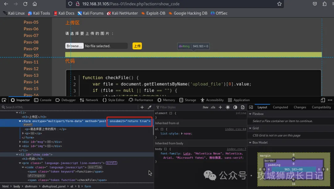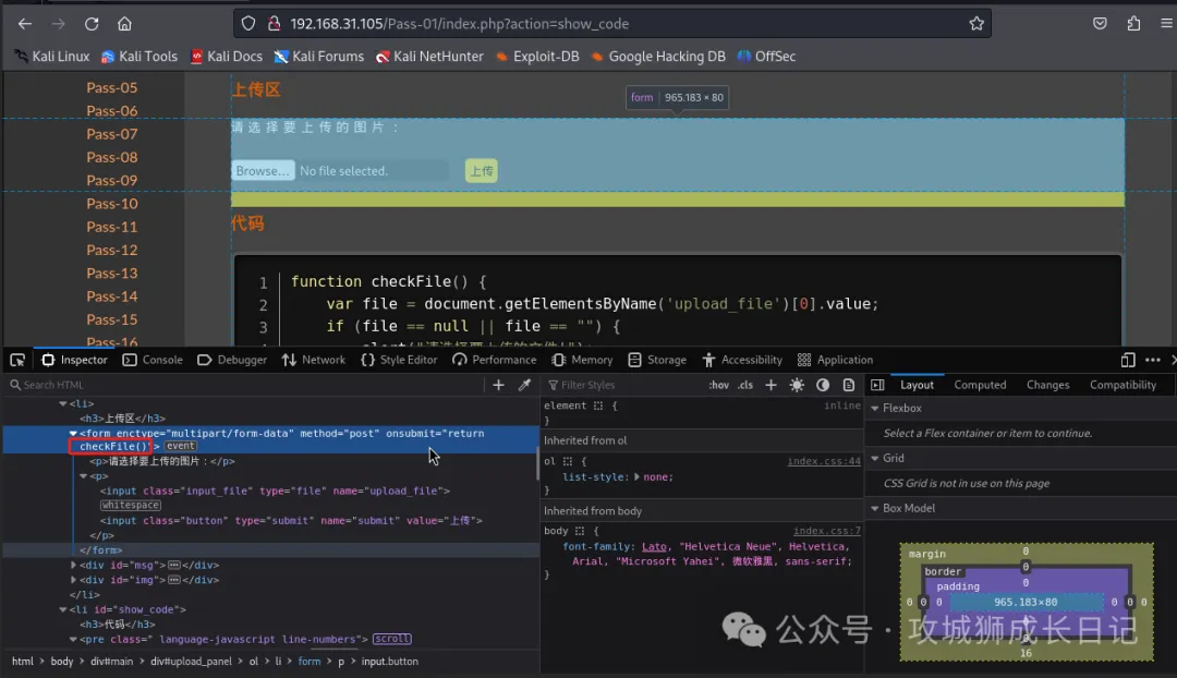 首先,打开第一关的页面,查看文件上传表单的 HTML 代码和 JavaScript 代码。通常可以通过浏览器的开发者工具F12来查看页面源代码和调试 JavaScript。