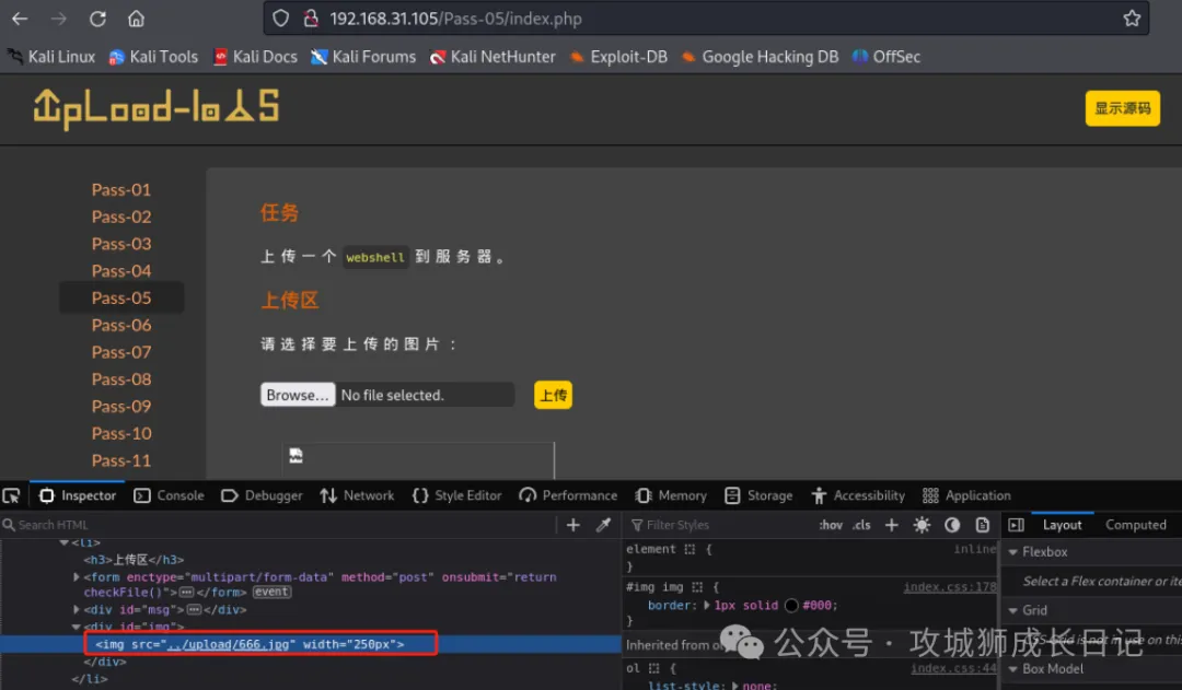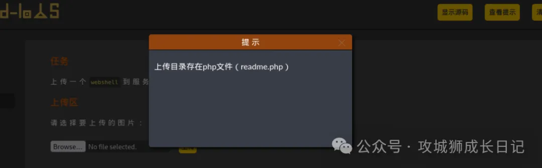 根据关卡5的提示,upload目录中存在一个readme.php,如下图所示: