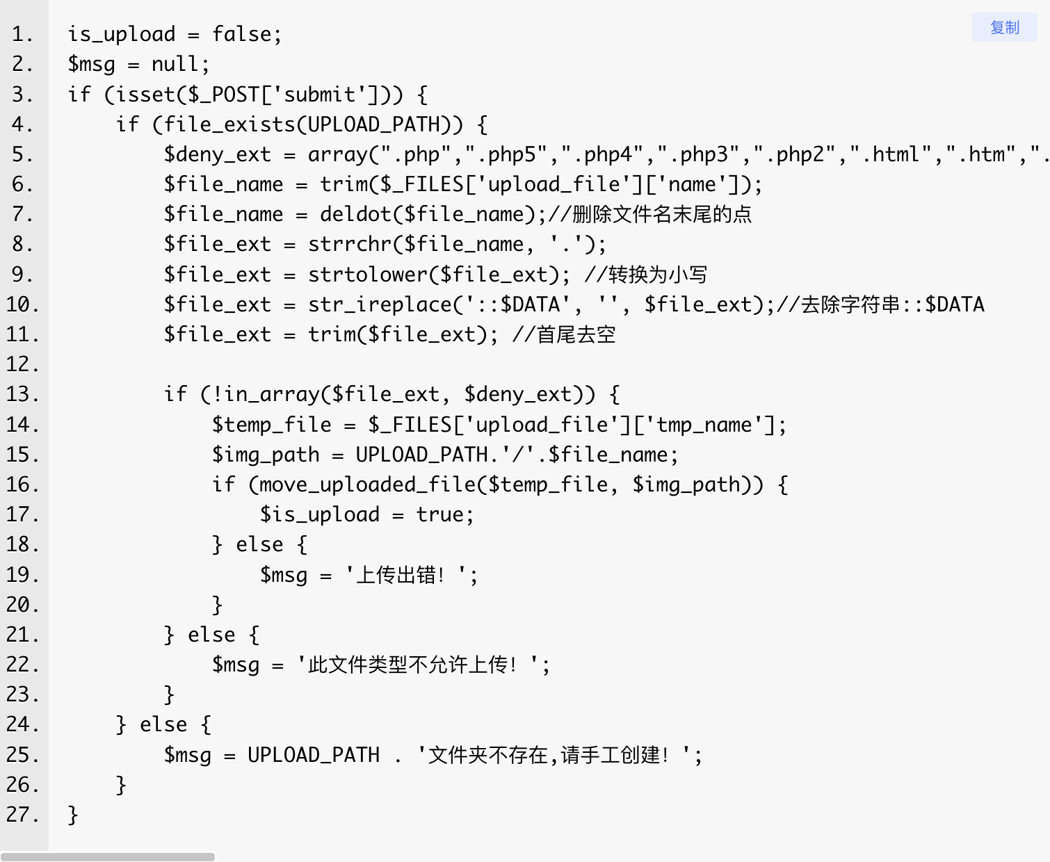 在观察源码后,发现源码中将所有可解析的文件后缀名都明确列出,包括大小写转换、空格和点号等处理。因此,无法正常上传PHP类文件,并且 .htaccess文件的上传也被拒绝。然而,通过仔细检查,发现有两个后缀名没有被限制,它们是 .php7和 .ini。