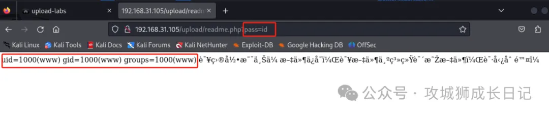 我通过访问这个readme.php文件,去触发自己上传的脚本文件。该请求将执行 id 命令,并显示当前用户详细信息。如图所示: