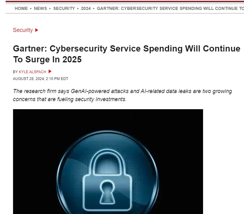 Gartner预测,2025年网络安全服务支出将持续快速增长,主要受生成式人工智能驱动的攻击和AI相关数据泄露等新兴威胁的推动。该研究公司最新报告显示,2024年信息安全终端用户支出预计增长15.1%,达2120亿美元。