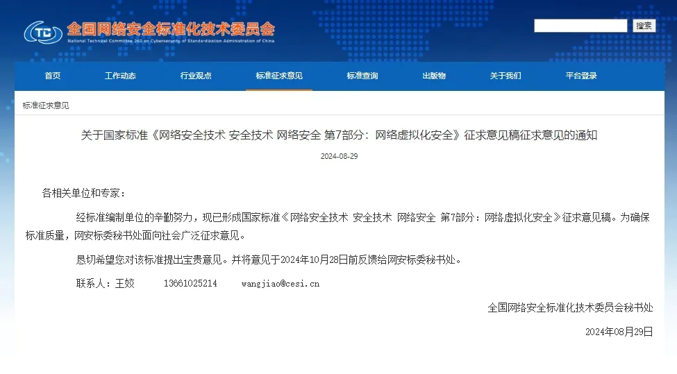 1、国家标准《网络安全技术 网络安全 第7部分:网络虚拟化安全》公开征求意见