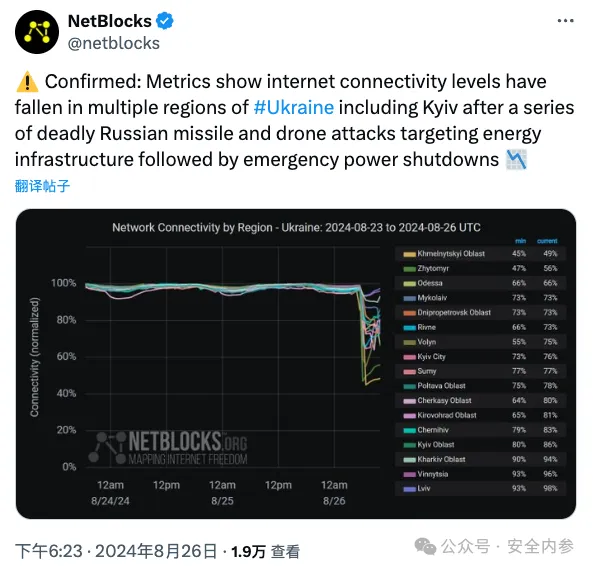 安全内参8月29日消息,最近几天,由于俄罗斯导弹和无人机袭击全国关键基础设施,数百万乌克兰人经历了互联网中断。