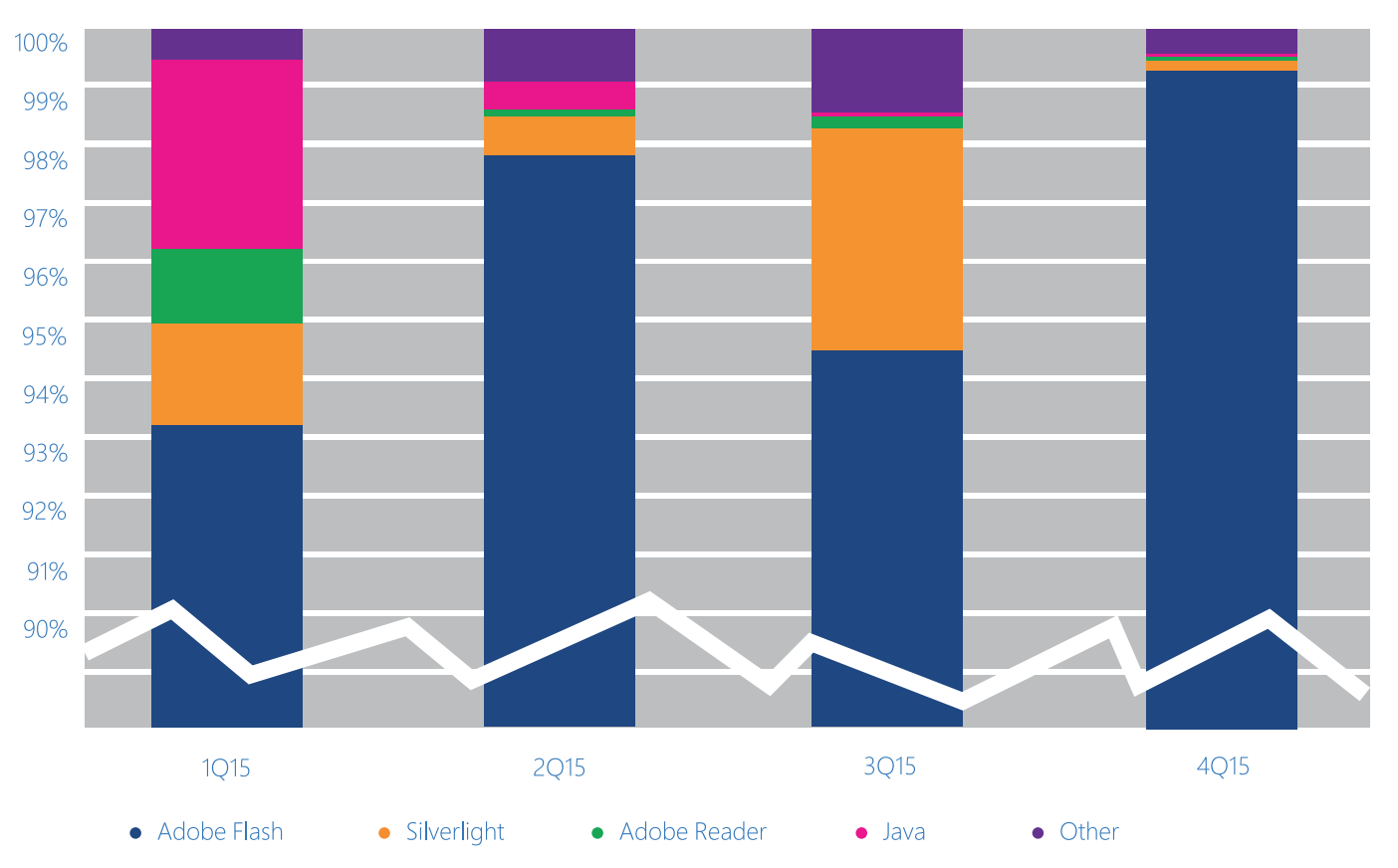 2015 年第一季度时含有针对 Flash Player 播放器的恶意网页在总体恶意网页中占有 93.3%,而到了第四季度则飙升到了 99.2%。