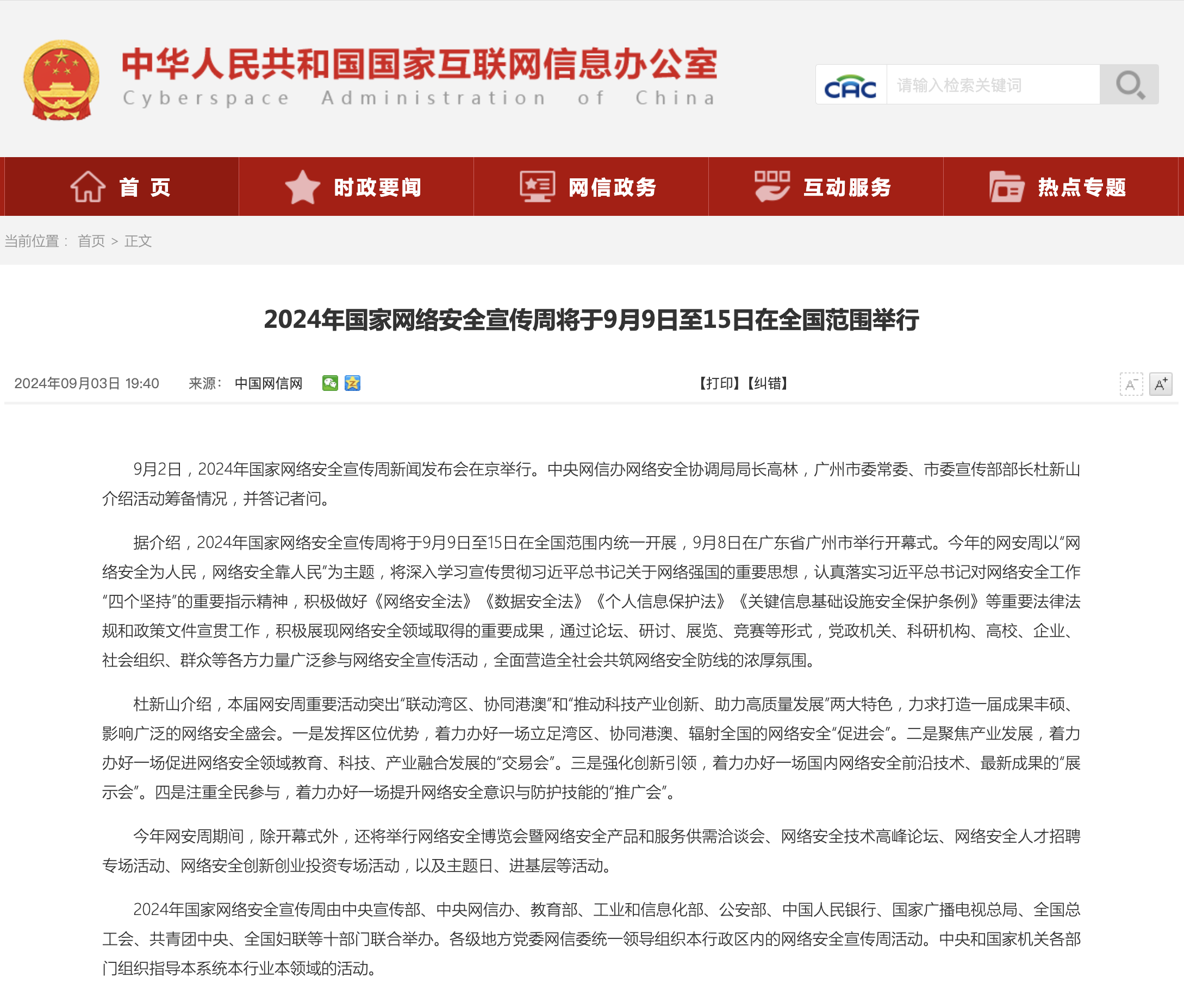 据介绍,2024年国家网络安全宣传周将于9月9日至15日在全国范围内统一开展,9月8日在广东省广州市举行开幕式。今年的网安周以“网络安全为人民,网络安全靠人民”为主题,将深入学习宣传贯彻习近平总书记关于网络强国的重要思想,认真落实习近平总书记对网络安全工作“四个坚持”的重要指示精神,积极做好《网络安全法》《数据安全法》《个人信息保护法》《关键信息基础设施安全保护条例》等重要法律法规和政策文件宣贯工作,积极展现网络安全领域取得的重要成果,通过论坛、研讨、展览、竞赛等形式,党政机关、科研机构、高校、企业、社会组织、群众等各方力量广泛参与网络安全宣传活动,全面营造全社会共筑网络安全防线的浓厚氛围。