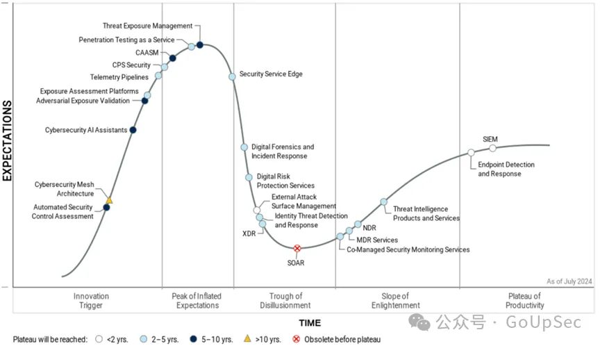2024年,安全运营(SecOps)领域迎来重大变革。根据Gartner最新发布的《安全运营技术成熟度曲线》报告,持续威胁暴露管理(CTEM)到达炒作周期的顶峰,Gartner为该概念增加了三个新兴类别:威胁暴露管理(Threat Exposure Management)、暴露评估平台(Exposure Assessment Platforms,EAP)以及对抗性暴露验证(Adversarial Exposure Validation,AEV)。