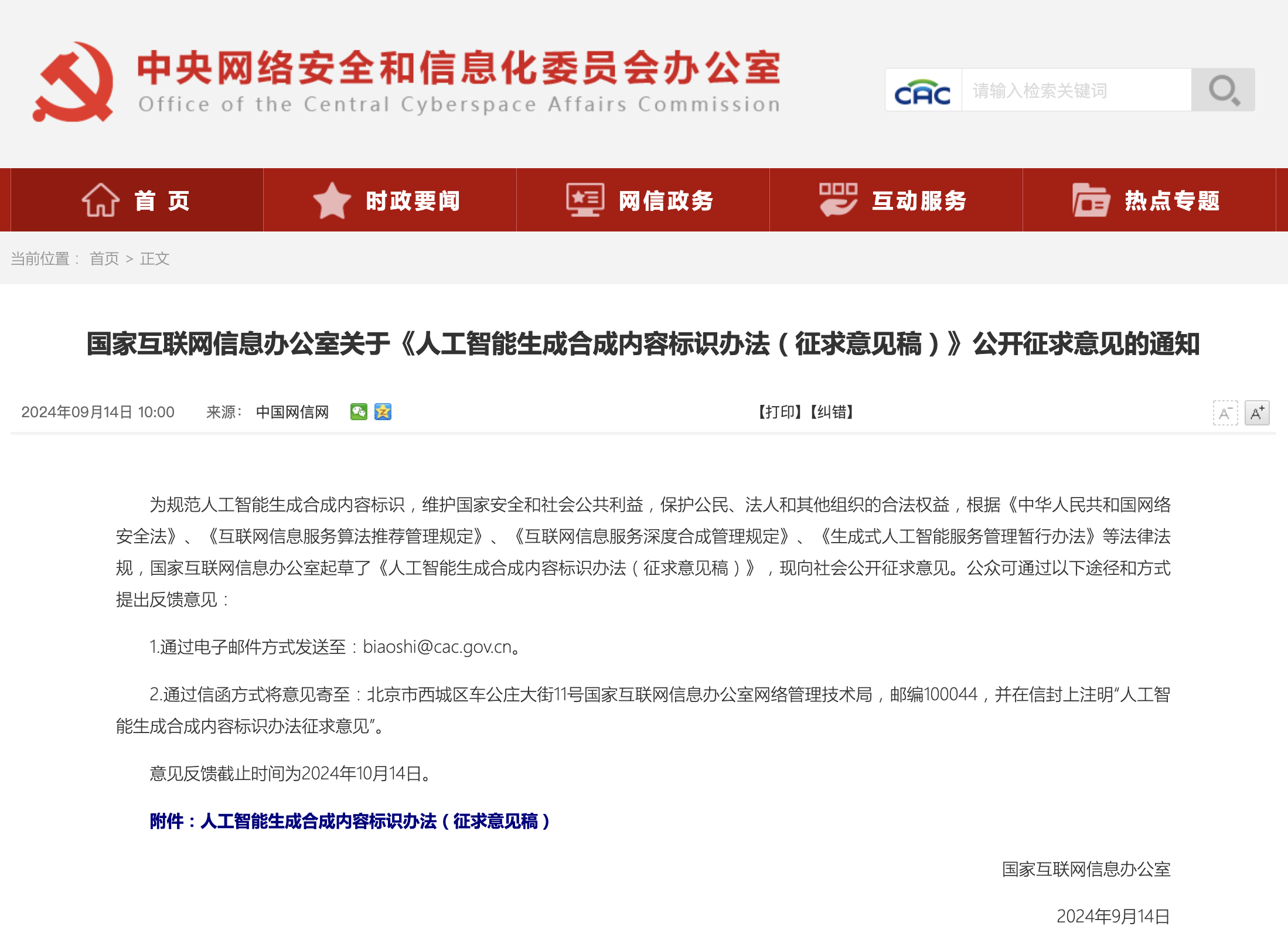 为规范人工智能生成合成内容标识,维护国家安全和社会公共利益,保护公民、法人和其他组织的合法权益,根据《中华人民共和国网络安全法》、《互联网信息服务算法推荐管理规定》、《互联网信息服务深度合成管理规定》、《生成式人工智能服务管理暂行办法》等法律法规,国家互联网信息办公室起草了《人工智能生成合成内容标识办法(征求意见稿)》,现向社会公开征求意见。公众可通过以下途径和方式提出反馈意见: