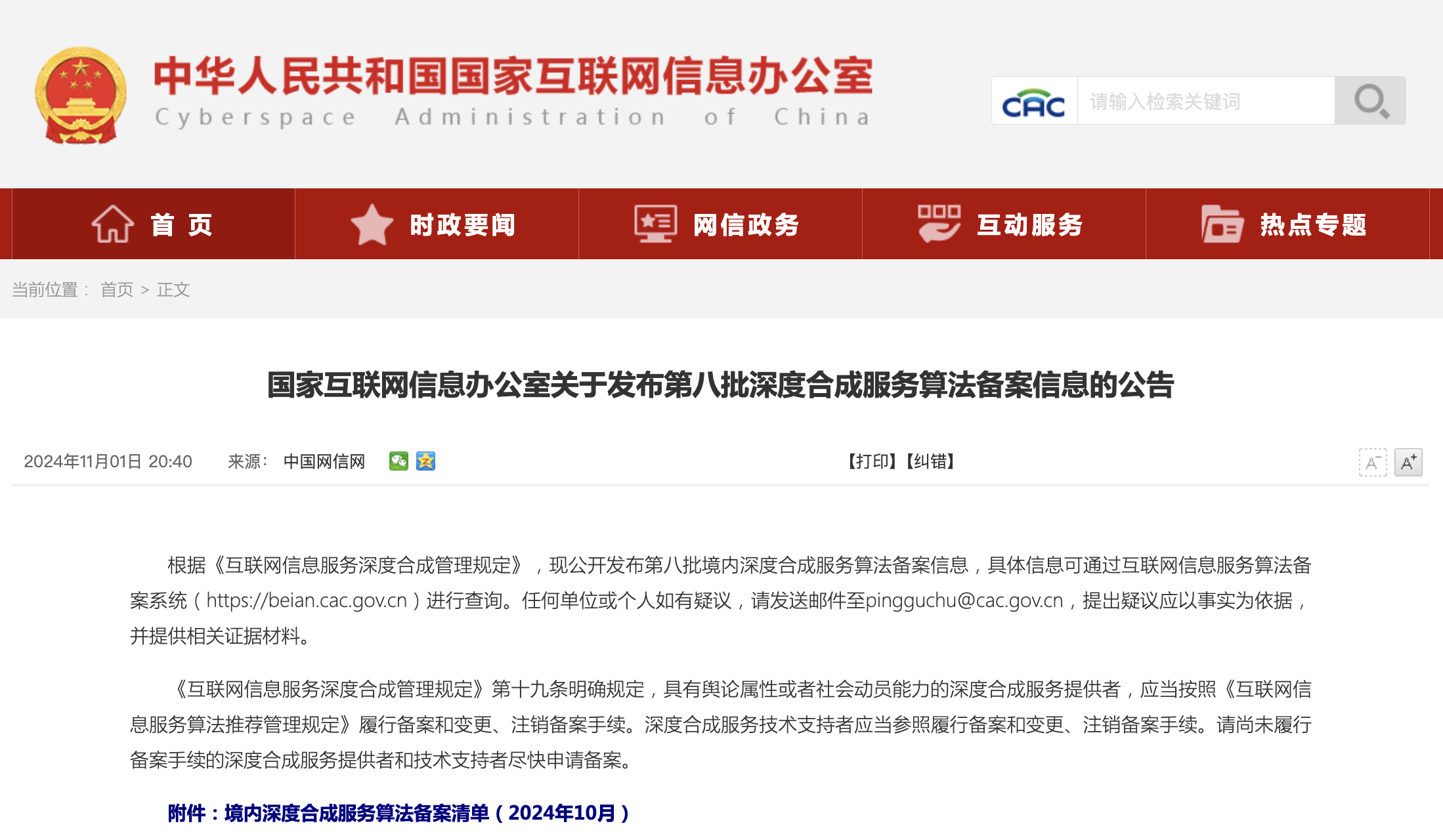 国家互联网信息办公室关于发布第八批深度合成服务算法备案信息的公告 |