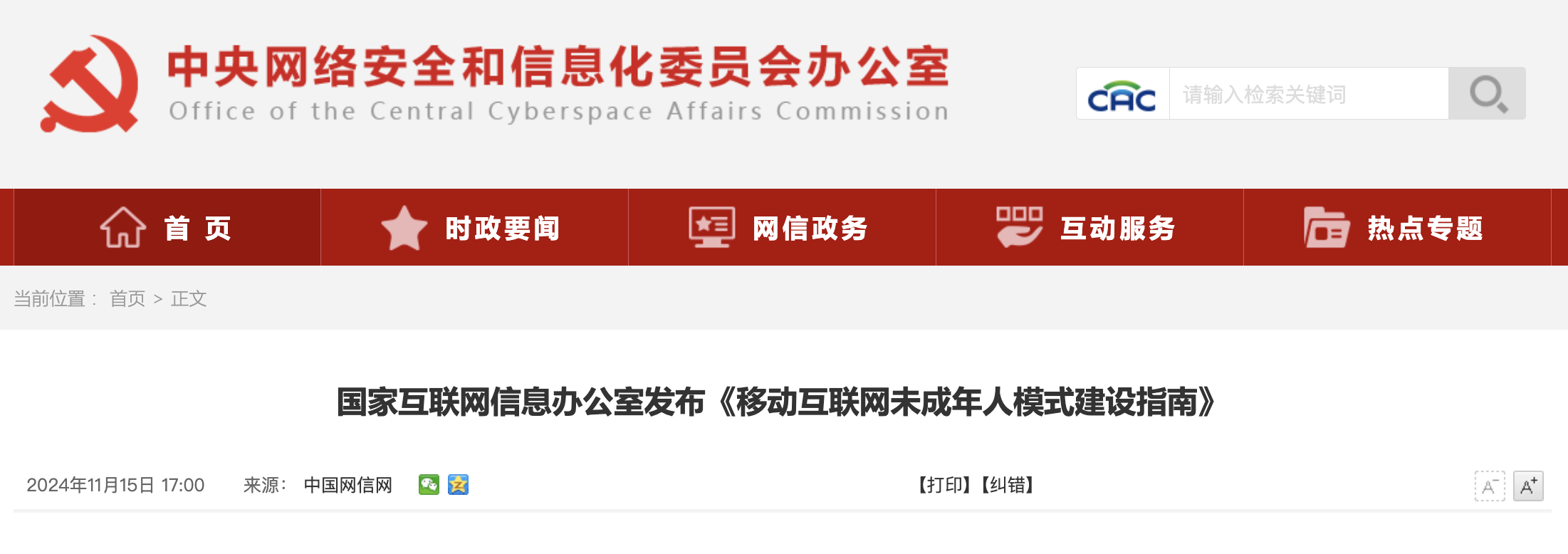 国家互联网信息办公室发布《移动互联网未成年人模式建设指南》