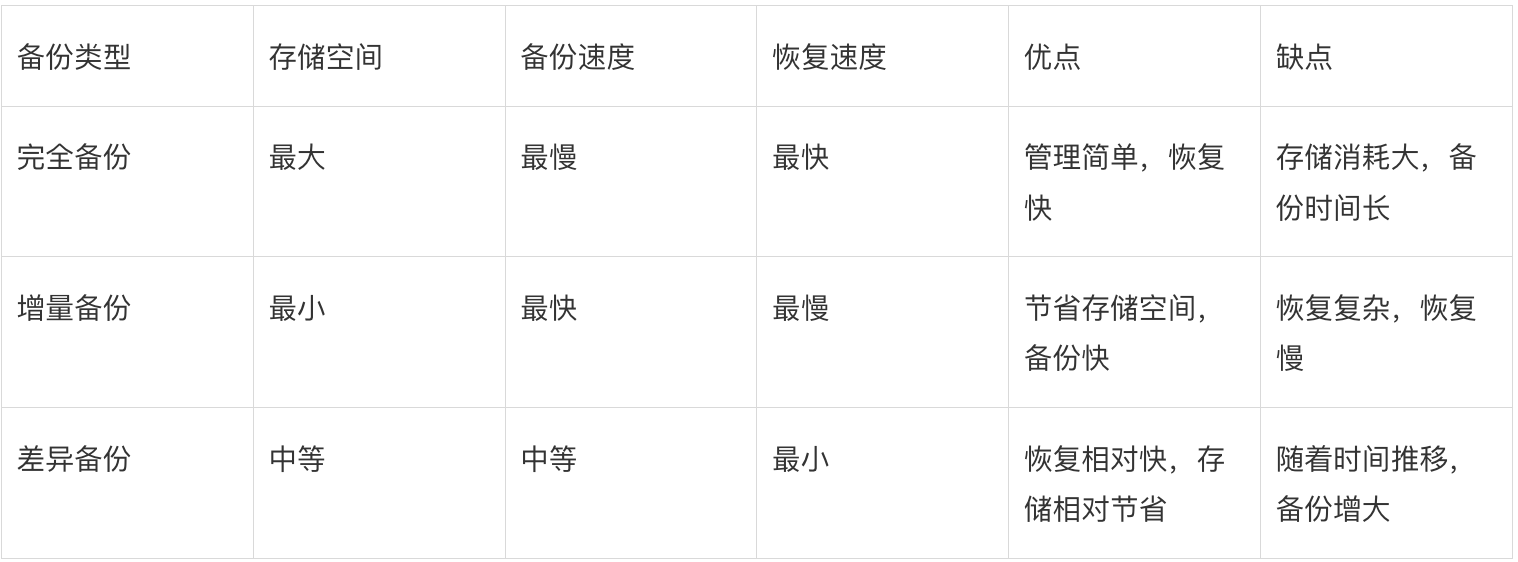 为了让大家更轻松地理解这三种备份方式,我特意整理了一个表格。希望这能帮助到大家!
