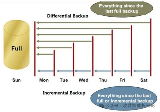 下图展示了差异备份与增量备份的区别,其中Cumulative为差异备份,Differetial增量备份: